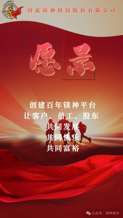 我們的企業(yè)愿景是:創(chuàng)建百年鎂神平臺(tái),讓客戶、員工、股東共同發(fā)展、共同快樂、共同富裕。