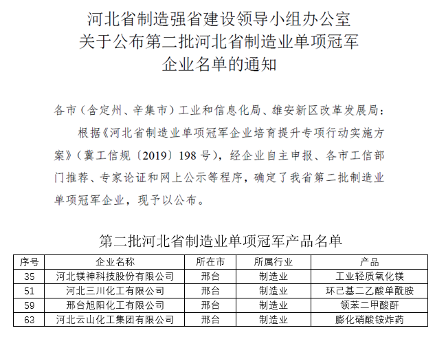 新年新氣象,企業再添新榮譽,爭得開門紅,近日,河北省工業和信息化廳官方網站公布了2020年“制造業單項冠軍產品”企業名單,我公司生產制造的“工業輕質氧化鎂”獲得了河北省制造強省建設領導小組授予的“制造業單項冠軍產品”稱號。本次邢臺市通過4家,我們是其中1家。